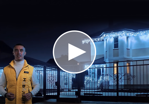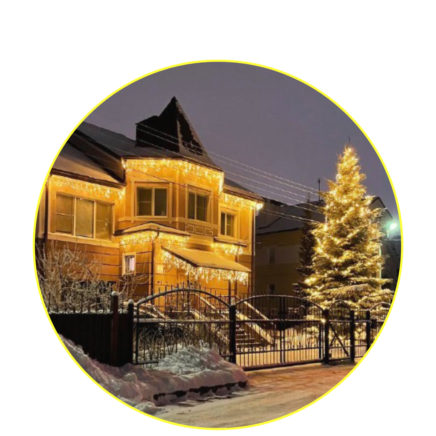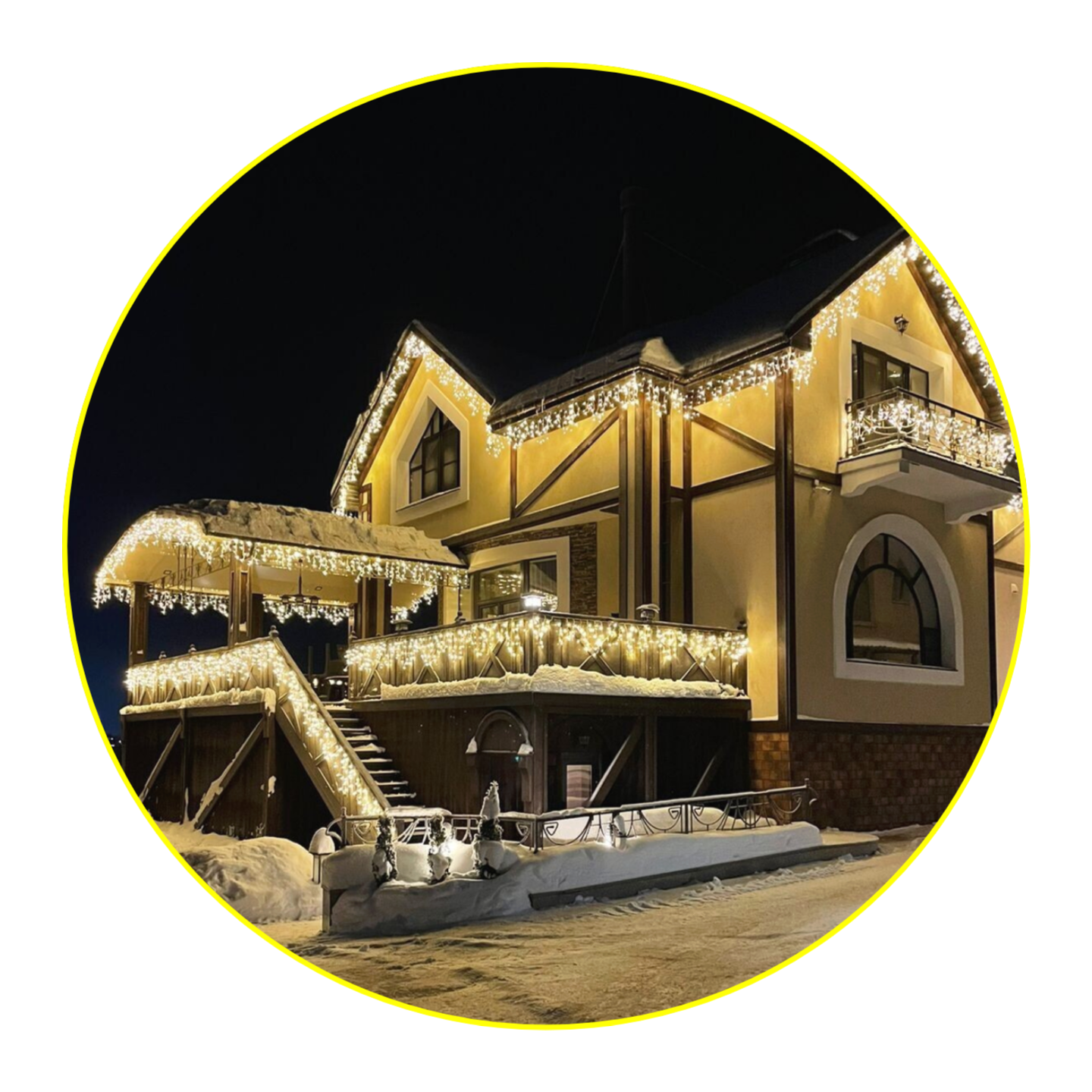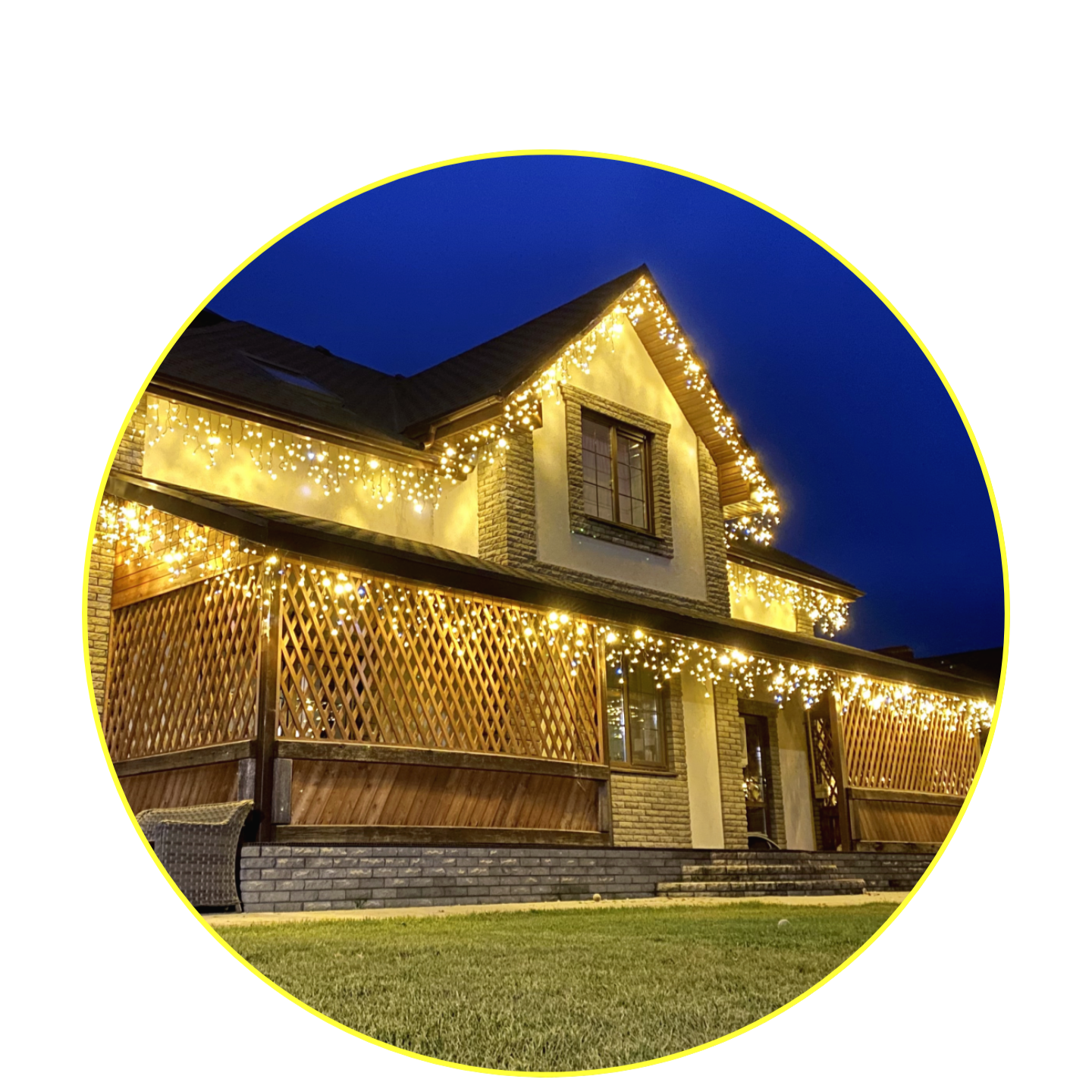 От 130 тыс и выше. Украшение дома по периметру карниза, построек во дворе, забора и елок. Класс защиты бахромы как в категории "Изящно", или вариант украшения бахромой IP65 с каучуковым проводом